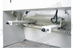 具有機(jī)動(dòng)后檔料調(diào)節(jié)功能。后檔料采用電子顯示,其記數(shù)器具有設(shè)置和記憶功能。提供了前進(jìn),后退和微動(dòng)三種調(diào)節(jié)功能。當(dāng)用戶所剪板料尺寸超過后擋料的擋料范圍時(shí),可為用戶提供后擋料抬起功能(選擇配置),讓超長板料不受限制。